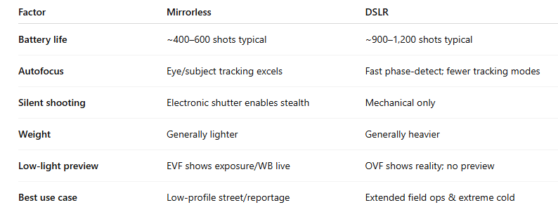 See my DSLR vs mirrorless guide for detailed field comparisons.
