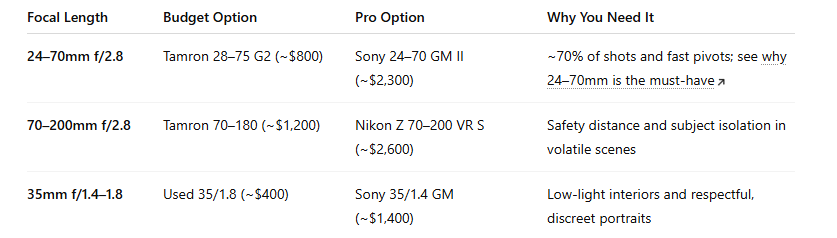 Start with 24-70mm f/2.8 (your most-used lens), add 70-200mm f/2.8 for safety distance, then fast 35mm for low-light work. My 24-70mm guide explains the focal length versatility.