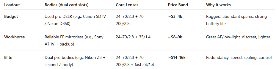 Recent gear profiles show emphasis on mobility: main body with 24-70mm f/2.8, spare body with 50mm f/1.2 for low-light work, and Level III body armor.